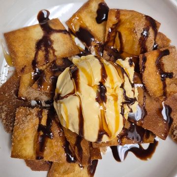 Flour tortilla chips with cinnamon sugar, 2 scoops of ice cream, and chocolate, caramel, and honey drizzle.
