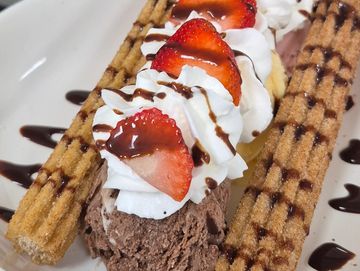 2 churros with 3 ice cream scoops, topped with whip cream, strawberries, chocolate drizzle, and cinnamon.