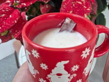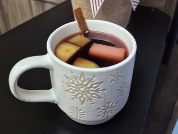 Hot fruit punch with assorted fruit, cinnamon, and sugar cane.