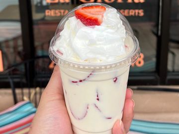 Shaved ice with banana, strawberry milk, and coconut syrup, topped with respective fruits.