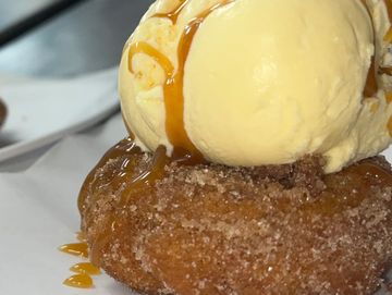 Soft semi-crunchy donut with 1 scoop of ice cream flavor of your choice, and chocolate or caramel drizzle.